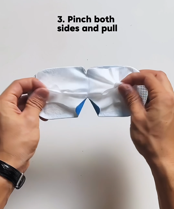 - Peel back the thin white fabric from the centre of the eye mask on both sides to reveal the fabric ear loops.